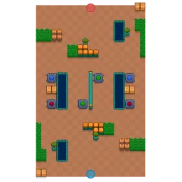 This map consists of three small bush clusters on each player's side. Four staggered lakes run down the map, splitting it into three lanes. A small wall cuts the middle of the map in half. Six teleporters can be used in the middle to get around the map. The map is diagonally symmetrical.