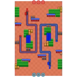 Set in the “Darryl’s Ship” environment, the map features pirate-themed obstacles such as pirate blocks, chests, wooden barrels, and pirate fences, along with bushes and lake pits. The layout includes tracks for each team’s minecart, with various obstacles providing cover and strategic points for ambushes.