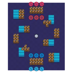The center is open with two wall clusters diagonal from it faced by two other bush clusters. Near the spawns are three wall clusters and two bush clusters. The map is diagonally symmetrical.