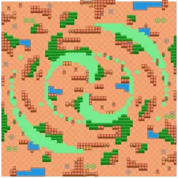 This map features a central area enclosed by walls, creating tight corridors and cubicles that encourage close-quarters combat. Power cubes are scattered around, especially in the middle, but the dense layout makes early confrontations frequent. The map is diagonally symmetrical.