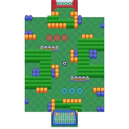 The map has two "squares" of bushes on the left and right sides. There is also a wall blocking the goal from direct shots, however, there is an area that is unblocked, allowing teams to score. There are also small 2x3 obstacles in the middle of the map. The map is diagonally symmetrical.
