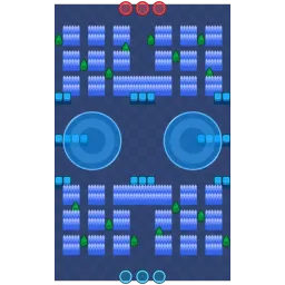 The map features a symmetrical layout with alternating open lanes and rocky barriers forming a checkerboard pattern across the map. The central area is typically more open, with large gaps that lead to the middle, creating clear sightlines but also offering little cover. The lanes are divided by tall walls, creating strategic chokepoints where players can use the cover to their advantage. Bushes are scattered throughout the map, particularly along the lanes, providing opportunities for ambushes and hiding. The map is diagonally symmetrical.