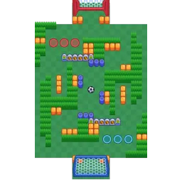 The map has a narrow center and broad sides. A H-like bush cluster grows inside smaller wall clusters and bushes in the top left and bottom right. Goals have 3 entrances and a wide barrier. It is a unique map in the sense that players do not all spawn in the center, they spawn a little to the right of where they would normally spawn. The map is diagonally symmetrical.