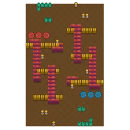 The map features an open middle area with minimal cover, making it a risky spot for players to engage in direct combat. The outer edges of the map are covered with bushes, providing plenty of hiding spots and ambush opportunities. This layout encourages players to either control the center with long-range attacks or navigate the bushes for a more stealthy approach. The balance between open space and bush-covered areas makes it essential to choose brawlers that can adapt to both playstyles.