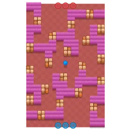 The map features many 2x2 walls distributed evenly across the map. Bushes connect the wall clusters to each other creating two large tangled cobwebs for each team. The left lane of the cobweb allows Brawlers to have access to the center and left lane, while the center ends off in 4 wall clusters. The map is diagonally symmetrical.