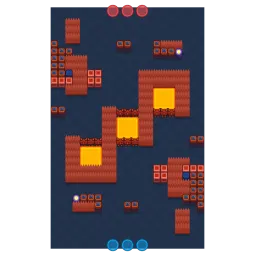 This map features a large central water area that divides the map, making it difficult for brawlers to cross without specific abilities. The outer edges have dense clusters of bushes, perfect for hiding and ambushing enemies. Open zones around the water offer little cover but are great for long-range Brawlers to engage in direct combat.