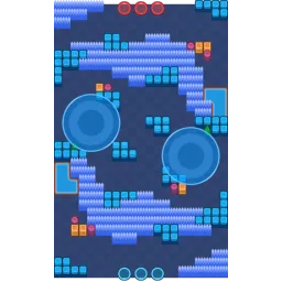 The map contains two zones both of which have few walls blocking them off. In the bottom and top section are a clump of bushes that spread to the nearby lakes stopping near the walls. Only four major walls block Brawlers from interacting with each other in the zones two of which create a clear diagonal lane connecting them. The map is diagonally symmetrical.