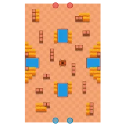 This map has very small bushes, and they are not in great quantity either, making ambushes difficult. The pools of water in the map divide the map into two lanes, creating a split environment. The short, scattered wall pieces located in many locations further divide the map into many sections, making intrusions difficult. This map is diagonally symmetrical.