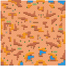 The map is engulfed by large amounts of walls with bushes connecting these walls to smaller ones. Power Cube boxes are distributed in trios or individually inside wall clusters. The map is littered with cacti, barrels, and boxes outside of these walls trapping and protecting Brawlers from long-ranged Brawlers. The map contains eight lakes with the largest of them being in the bottom portion of this map. Core Crumble has no symmetry.