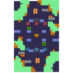 The map's center is blocked by rows of walls. In each team's corner is an open area with a poison gas ring and a poison gas cage in the opposite corner. The map features 2 healing pads near to the poison gas rings. The map is diagonally symmetrical.