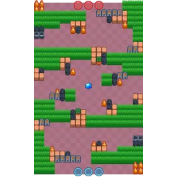 The map has many big bush clumps stretching horizontally across near the middle of the map, with each bush clump separated from the other with boxes, barrels and blocks. Breakable cones line the corners of the middle and a tree pot stands near the middle on each side. Neon fences are dotted around the map. The map itself is diagonally symmetrical.