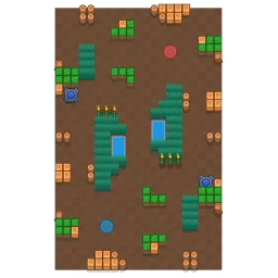 The exterior of the map mainly has 2x2 walls that touch against the edge of the map, and each side also contains a teleporter that has some larger cover and bushes near it. Surrounding the center are 2 patches of bushes that surround a small puddle of water. The center is almost completely open, the only cover here consisting of an L shaped wall. The map is diagonally symmetrical.