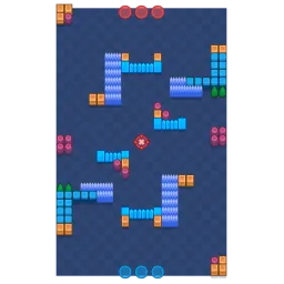 There are horizontal shapes of walls with bushes going vertically to one of the sides of each of the walls, making a right angle. There is a small amount of cover on each side, and there are groups of walls with a small number of bushes near each side's corner. The map is diagonally symmetrical.