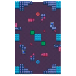 The map consists of 3 lanes with the open centre being a square of bushes with small lakes at two of its corners. In line but further way from the other two corners of the main bush is a teleporter protected by grave blocks. There is a decent amount of cover in the form of grave blocks, boxes and barrels in the spawn area and around it.