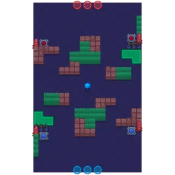 There are teleporters (with obstacles in front of them) on either side of each team's spawning area, which lets Brawlers switch lanes quickly. The middle lane has a large cluster of bushes vertically surrounded by walls. Each lane has a small space filled with a small amount of bushes and walls next to each other. The map is diagonally symmetrical.
