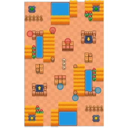 The center is filled with various types of cover, including a large bush patch close to each teams' spawn. There is a teleporter in every corner, with one that is covered with rope fences and one that is in a patch of grass with some cacti. The left and right sides of the map are mostly bare other than a bit of grass next to some cacti. The center top and bottom have a lake surrounded by some bush. This map is diagonally symmetrical.