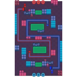 In front of the spawns are two walls on each side of a small body of water. There are boxes and bushes in 2x2s scattered around the map, and there are thin lines of bushes on each horizontal side of the map. The payload moves in the shape loosely similar to an S. The map is diagonally symmetrical.