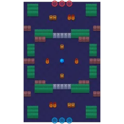 The map has little to no cover at all with a few thin barriers present at the sides and back, along with some bushes near them. The center has the least cover, with only four tiles surrounding the star. The map is diagonally symmetrical.