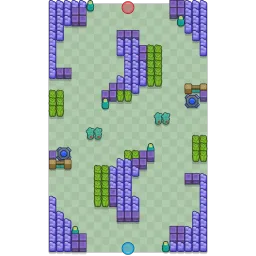 This map has corners which are completely filled with clumps of walls with one wall in the middle for each side that has bushes lined up next to it. There are two teleporters with walls on one side of each of them and two 2x1 plants in the middle. This map is diagonally symmetrical.
