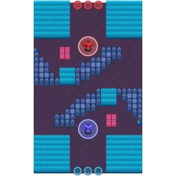 This map has an open top and bottom with large bush clusters in each corner. Two long curved walls barricade the center with smaller holes filled with bushes inside and boxes just outside. The map is diagonally symmetrical.