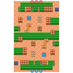 The map's center is defined with a long and narrow bush strip that is interrupted by some wall clusters. Further away from the center, there are a few smaller bush clusters flanked by more wall clusters and a couple of lakes. The spawns are met with another pair of long bush strips neighboring a teleporter, split by more walls. The map is diagonally symmetrical.