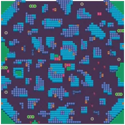 The map is rather confined but contains open areas in-between the closed ones. Wall clusters have small strips of bushes with the largest found in the center, near to other major clusters. Power Cube boxes are found near to each other with the most found in the center. While the map has no symmetry, some areas of the map are similar to each other, such as the center and the corners with the lakes.