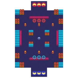 There are three bumpers in front of each side's spawning area's barriers. The middle is open with small bits of cover around it. On the sides are bushes with walls to their side. The map is diagonally symmetrical.