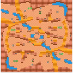 The map has arched bushes and zig-zagging lakes, seemingly being shaped like an eye. The center of this map contains 8 Power Cube boxes, but outside of the center boxes are usually found in pairs. The arched bushes extend outward towards the edges of the map. The bottom left and top right are both secured by double layered walls that leads to little entrances. The center is fairly open with bushes taking a large role in the map's mechanics. The map is diagonally symmetrical.
