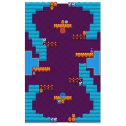 This is a medium-sized map with two main open lanes that lead towards the central area. The map is characterized by rocky terrain and dense obstacles that create a lot of choke points along the sides. The central area is more open, with a broad, clear path but surrounded by bushes and rocks, allowing for some cover.