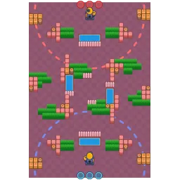 The map is split into three clear lanes with vertical fences, walls, and lakes separating them from each other. The middle is isolated from the sides, so switching lanes is difficult. Near the IKE turrets are a lake and a few wall barriers. The map is diagonally symmetrical.