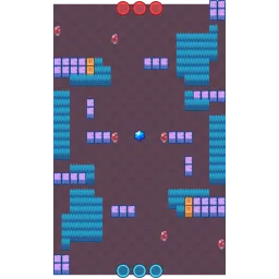 This map features a long, narrow layout with open spaces on the sides and a central area filled with obstacles like walls and bushes. The map is divided into two main sections, with a central path and the team’s spawn areas at the opposite ends. The walls along the middle provide both cover and strategic chokepoints, but the open flanks on either side allow for quick side attacks. The map is diagonally symmetrical.