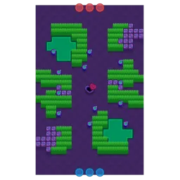 The map has two large lakes near the top-left and bottom-right corners, with large wall and bush clusters opposite them. To the right and left of the center are two bush clusters peppered with some mushrooms and walls. The map is diagonally symmetrical.
