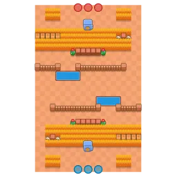 The map is split into three horizontal lanes zig-zagging around the center. The top and bottom section of the map contain fencing and large bush clusters. Each horizontal lane contains shortcuts that can be traversed with the use of lakes. The map is diagonally symmetrical.