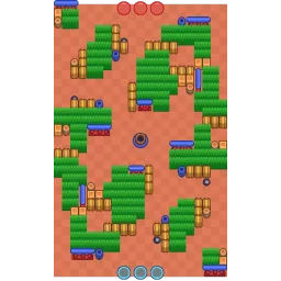 The map contains a striking amount of bushes, with walls lining the entrances between these bush clusters. Two T-shaped bush clusters located near the center of the map have entrances pointed towards the gem mine. The map is diagonally symmetrical.