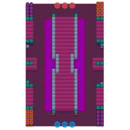 This map features a narrow and challenging central path that creates a clear division between the two teams' territories. This lane is typically lined with dense obstacles like walls and bushes that make movement tricky and force players to navigate with caution. The map is diagonally symmetrical.