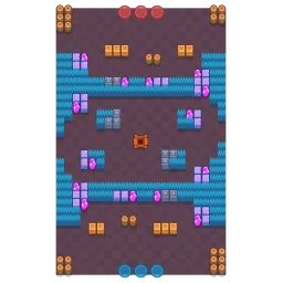 The map has an open center and two H-like bushes that span the width of the map. The side bushes are closer to each other than the bushes in the center. In the center are four three-tiles worth of bushes and walls which Brawlers can use to defend themselves. The horizontal pathways in the center top and bottom are narrow and are blocked off completely on one side by a 2x3 wall. The map is diagonally symmetrical.