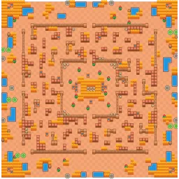 The map outside of the maze is flooded with lakes and has bushes in each corner. The squarish maze on the inside has several walls most of which are bordering it. The center of the maze is relatively open but contains a bush border and several cacti. The map has no symmetry.