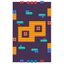 The map has four clusters of walls across the map, with the clusters closest to the middle having rings of bushes around them. Near the spawns, there are fences, and some crates. The map is diagonally symmetrical.