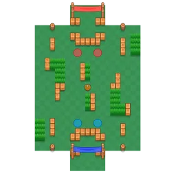While the centre of the map is relatively open - for they do not have many walls blocking each team's range - the back of the map is quite fortified with walls. On the side of the map are various wall pieces and bushes scattered around the map, though they are not as useful since the middle lane is not obstructed significantly and allows enemies to advance through the path easily, removing the need to switch lanes. This map is diagonally symmetrical.