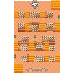 There are four rows of candles, bushes and U-shaped walls. There are also two 4x4 bushes in the top right and bottom left corner. The bushes and pathways are narrow. This map is diagonally symmetrical except the two batches of candles at the middle of this map.