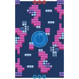 The map has a single zone in the center with a long bush patch growing towards it behind a wall. The sides have teleporters that launch Brawlers across the map behind U-like fencing. The map is diagonally symmetrical.