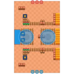 The map contains two zones. Rope fences completely block off the center bottom and top creating small openings and passageways for the zones. Launch pads near each team launch Brawlers to the left zone while launch pads within the left zone launch Brawlers to the right zone. The right zone can also be accessed through a three tile wide entrance in the right side of the map. The map is horizontally symmetrical.