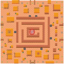 The map's center is shaped into a maze with easy access to the end of it through launch pads just outside its walls. Power Cubes spawn in the map's edges as well as Brawlers. There are also bushes and a few walls outside of the maze. The maze has three entrances and one entrance in the center left which accesses the center. There is no symmetry on this map.