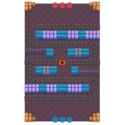 The map consists of multiple layers of interchanging cover and minecart tracks. There are five minecart track layers and three lanes besides wall and bush clusters. Minecarts coming from the left will turn to the enemy side, while minecarts coming from the right will turn to your team's side. There are crates and barrels located at the corners of the wall. The map is diagonally symmetrical.