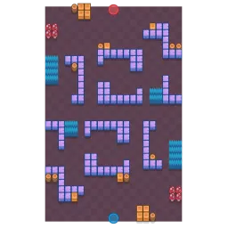This map features a lot of U-shaped walls, with the openings facing in all directions, with bushes scattered around the map. This map is diagonally symmetrical.