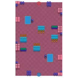 Each side contains a bundle of walls on the far side on the left, with a bit of fences providing cover next to them. There are small pools near each side's spawn, and in the front of each side is a pair of bushes behind rope fences. The map is diagonally symmetrical.
