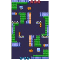 The map consists of three bush sections on each side of the map: one underneath the safe, one above the safe, and two to the side. There are walls placed near bushed and near the center. The map is diagonally symmetrical.