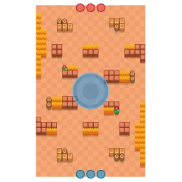 The map is a single zone map with bush strips growing at the sides that stop midway. The map includes little cover, with the major walls located in confined spaces near the zone. The placement of the wall clusters leaves one side open for attack through the zone.