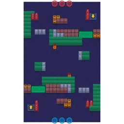 The map has some walls. The middle is mostly open, with so little bushes and walls to complement it. There is also a jump pad on the left side of the spawn points. This map is diagonally symmetrical.