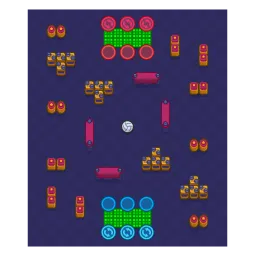 The ball is surrounded by a couple small wall clusters with smaller jagged walls filling the outside of the map. There is also a small section of speed tiles near both spawns. The map is diagonally symmetrical.
